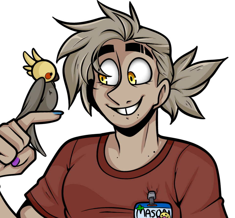 Mason Ryder-FinchAge: 19 (in 1996)Birthday: 08/05/1973Ethnicity: east Asian / EuropeanHeight: 5'2"Weight: 150 poundsEyes: GoldenrodSexuality: BisexualGender: Trans manHair: Sandy BlondeMental/physical ailments: ADHD, tourettesAbout: Hyper, easily excited, loves working, has several jobs, secretly incredibly rich but chooses to live like a miser. He owns several fancy birds in his small apartment, might be a bird. Even wears Mya out after being around him for too long. Has a strained relationship with his dad after the death of his mother, but it's improving.