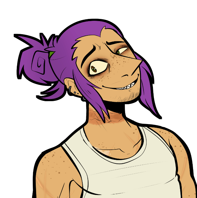 Mya GrahamAge: 26 (in 1996)Birthday: 06/06/1970Ethnicity: White/MongolianHeight: 5'6"Weight: 230 poundsEyes: GreenSexuality: Lesbian (in a poly relationship with Tai and Winter after the events of PURPLE)Gender: Trans WomanHair: BurgundyMental/physical ailments: Back pain, PTSD, ADHDAbout: Friendly but tough, Loves bandaids and medical supplies and cats. Extrovert and WILL be your friend, but wont take your shit and will shut you down and put you right. She has a dry sense of humor and makes jokes when she’s nervous, but sometimes misses social cues and might hurt your feelings without meaning to. Works at a cafe and a bookstore.